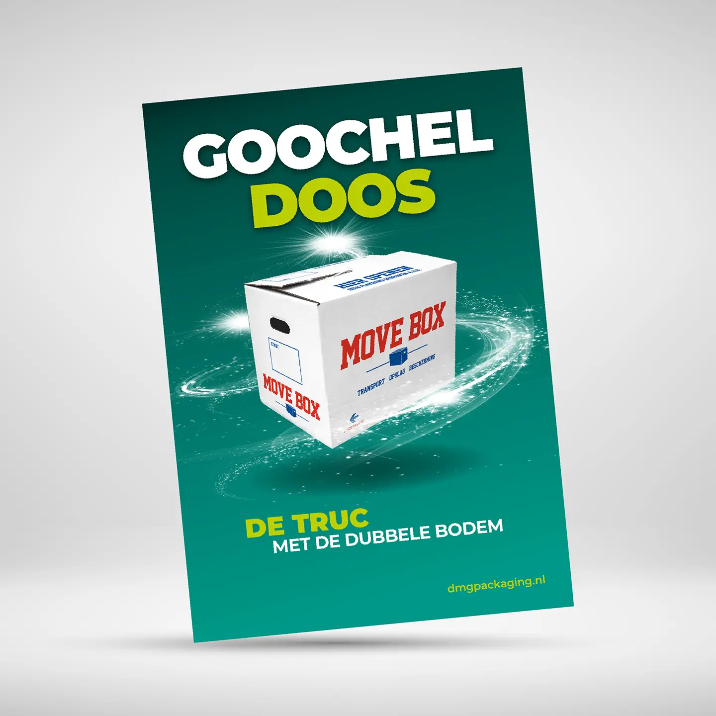 ARTbeving bedacht vervolgens de term ‘Goocheldoos met Dubbele Bodem’ voor deze beroemde MoveBox van DMG. In de digitale nieuwsbrief worden verhuisbedrijven en winkels van verpakkingsmaterialen ‘stiekem’ op de hoogte gebracht hoe deze goocheltruc werkt om dozen extra zwaar te kunnen belasten.